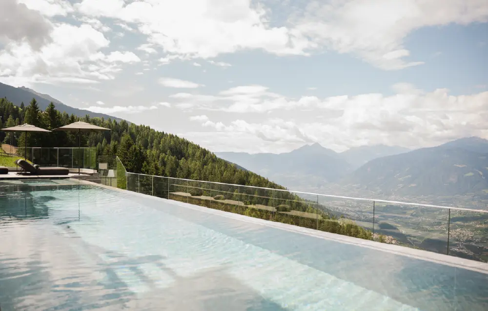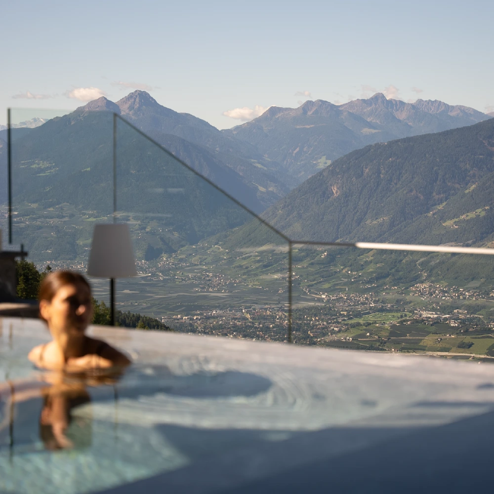 Eintauchen, abschalten, staunen – unser beheizter Outdoor-Infinity-Pool mit integriertem Whirlpool bietet Entspannung pur mit Blick über das gesamte Meraner Land. Umgeben von der Stille der Berge genießen Sie warme Stunden im Wasser, während sich der Himmel langsam verfärbt und der Tag zur Ruhe kommt.